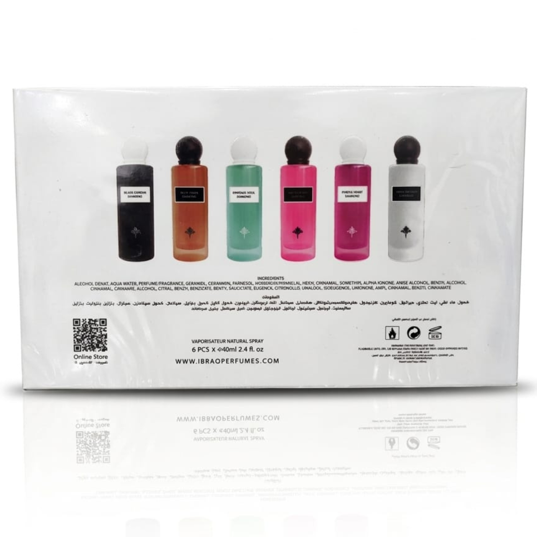 Diamond Collection by Ibraq is a luxurious gift set containing six exquisite 40 ml perfumes, designed for fragrance lovers who appreciate variety, sophistication, and unique olfactory experiences. Each perfume has a distinct character while maintaining a luxurious, elegant signature.