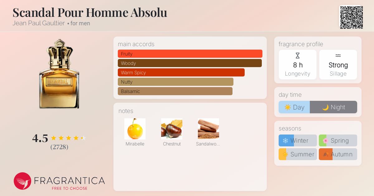 Scandal Pour Homme Absolu by Jean Paul Gaultier is a bold and sensual masculine fragrance that pushes seduction to its limits. Built around a rich gourmand–woody structure, it blends juicy sweetness with deep warmth, creating a dark, commanding presence that is both addictive and unforgettable.